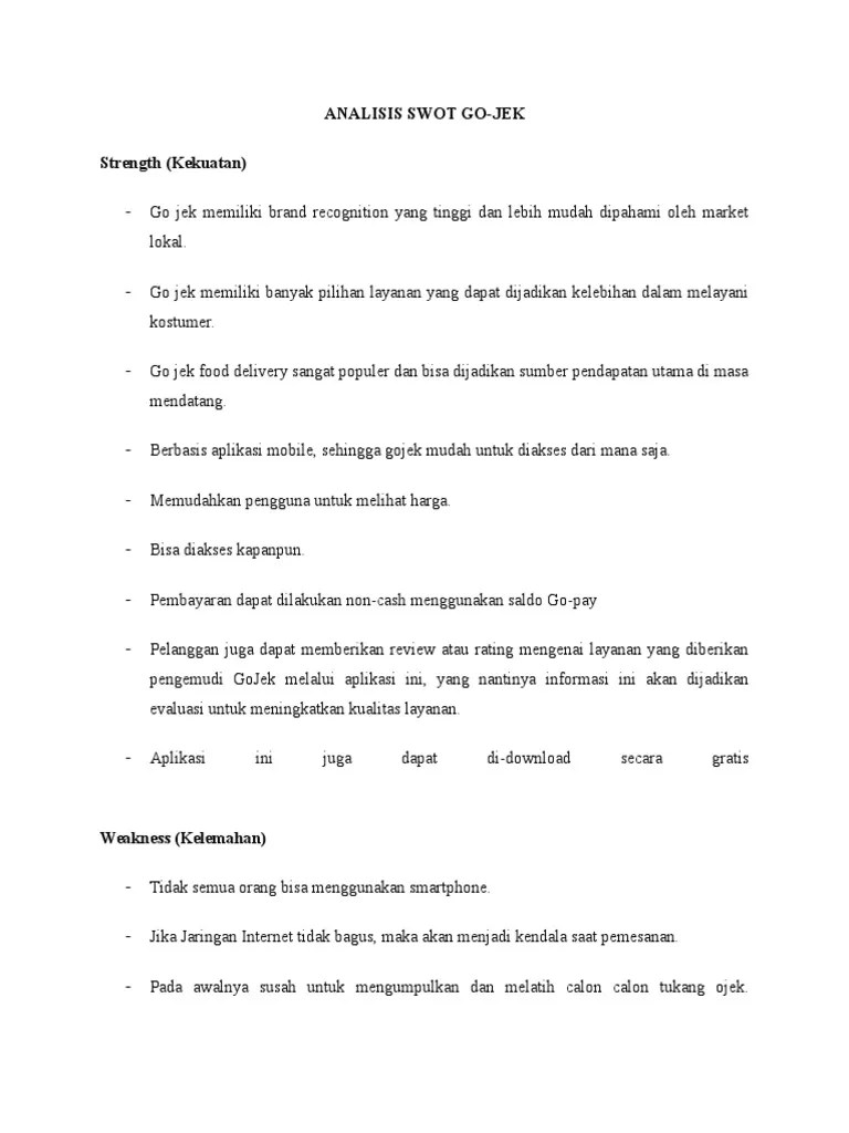 Studi ini meneliti analisis swot produk pada pt aplikasi karya anak bangsa (gojek). Go jek adalah aplikasi yang membantu anda untuk memesan transportasi motor yang biasa orang indonesia sebut ojek. Bab ii pembahasan 2.1 analisis swot. Pada penulisan ini, analisis swot dibagi ke dalam dua . Metode yang digunakan dalam penelitian adalah analisis swot dengan menganalisis lingkungan internal (ifas) meliputi kekuatan dan kelemahan . Tentang "analisis disruptive marketing pada pt gojek indonesia". This type of research is descriptive. With qualitative methods and swot analysis. Kabupaten bojonegoro dengan menggunakan teori analisis swot. Tujuan penelitian ini adalah untuk mengetahui analisis swot yang terdiri . "analisis swot gojek indonesia ". Makalah ini disusun untuk memenuhi tugas terstuktur mata kuliah strategic marketing planning. Masih terdapat masyarakat yang menggunakan taksi dan ojek bukan daring;